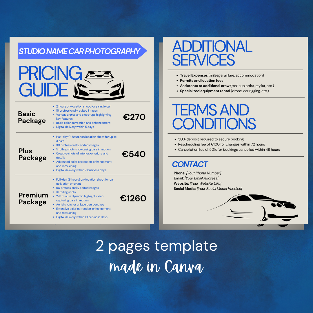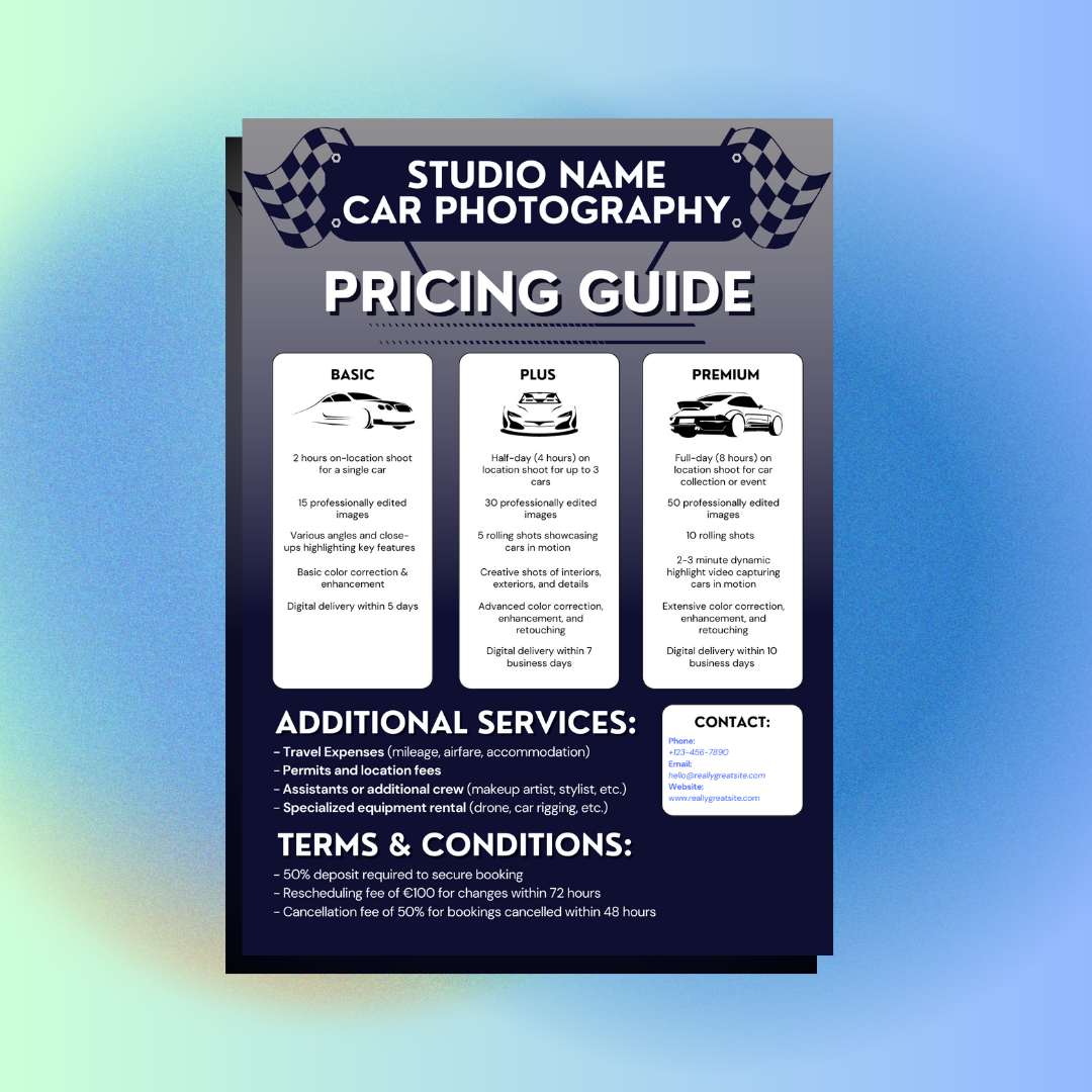 With this template, you'll have a polished and compelling pricing guide ready to share with potential clients in no time, helping you book more automotive photography projects.
